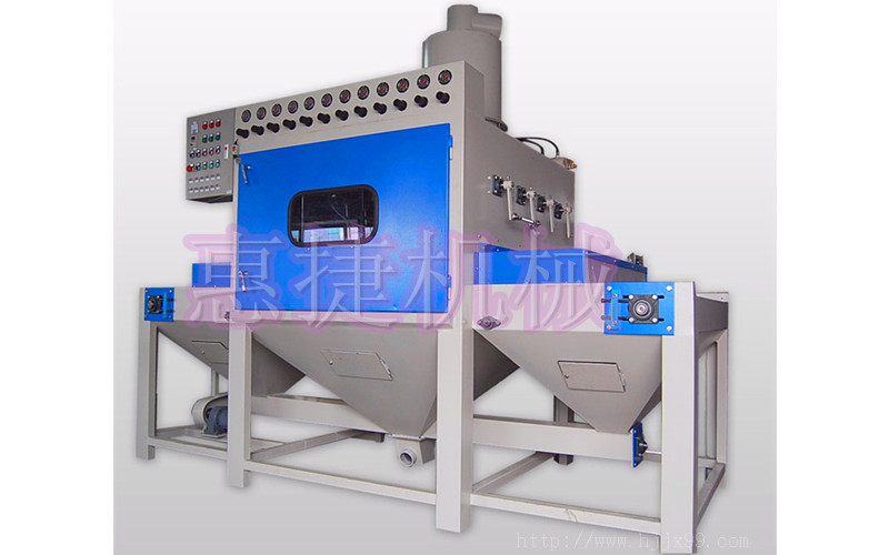 三、HJ-1080-12A枪输送式全自动喷砂机在喷砂过程中,产品可直接放置或装在夹具上放入输送带上,匀速通过喷砂室,喷枪在电机驱动下随机构作往复摆动喷砂,保证被加工工件表面均匀一致,加工完毕,工件通过吹净室由风枪吹净表余砂后由输送线另一端输出。