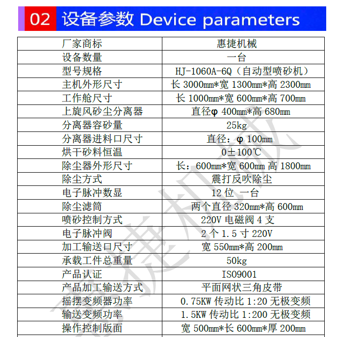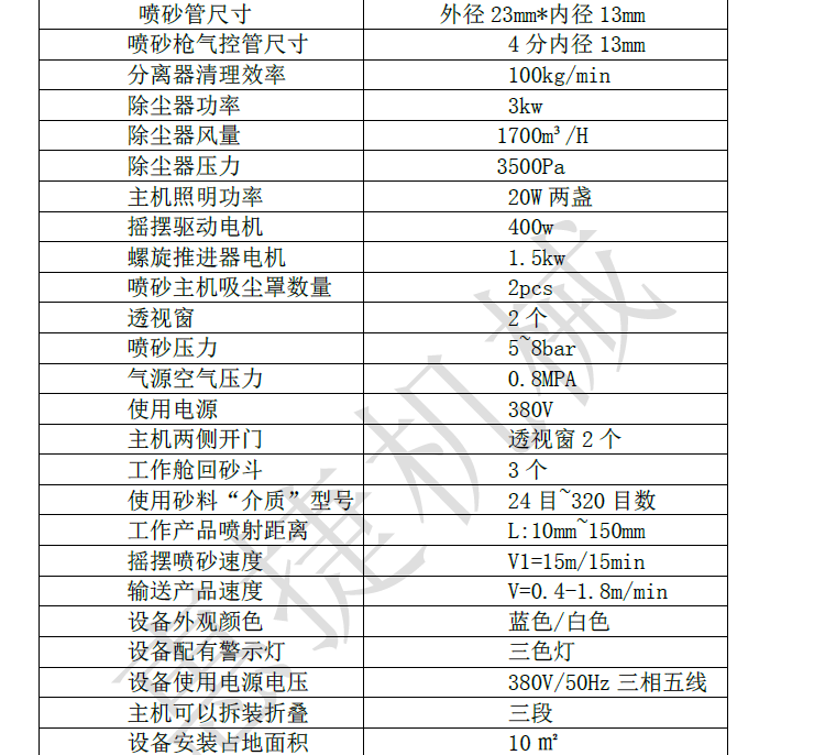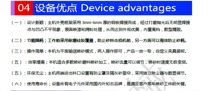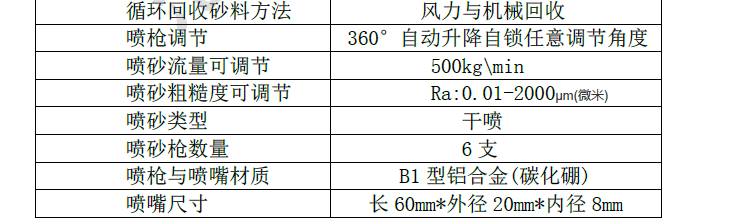 本机配置高,摇摆喷砂抢与输送机构速度快,喷砂产量高,品质好。