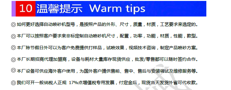 该输送式自动型喷砂机用于完成尺寸宽度范围为400mm以内。