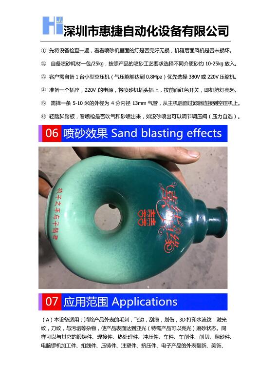 供应批发/零售惠州酒瓶喷砂机-广州酒罐喷砂机-深圳市惠捷酒坛喷砂机特点:适合各种非金属酒坛,酒罐,酒瓶,酒壶喷砂刻字/磨砂处理。优点“单瓶喷砂个性制定”也可以批量产生酒瓶,喷砂酒瓶效果优质,深雕浮雕凹凸3D感观强,增强喷油漆附着力,也可以喷散装酒坛,罐,瓶,杯子磨砂面与蒙雾砂效果,喷砂细腻,生产效率高,制造酒壶,酒罐,酒瓶,酒杯,酒器皿绿色环保,喷砂酒瓶100%无不良品,设备优势:节能降耗,维修率低,价格实在,环保无尘,制造酒瓶表面加工工艺简单易学,耗材也相当便宜。