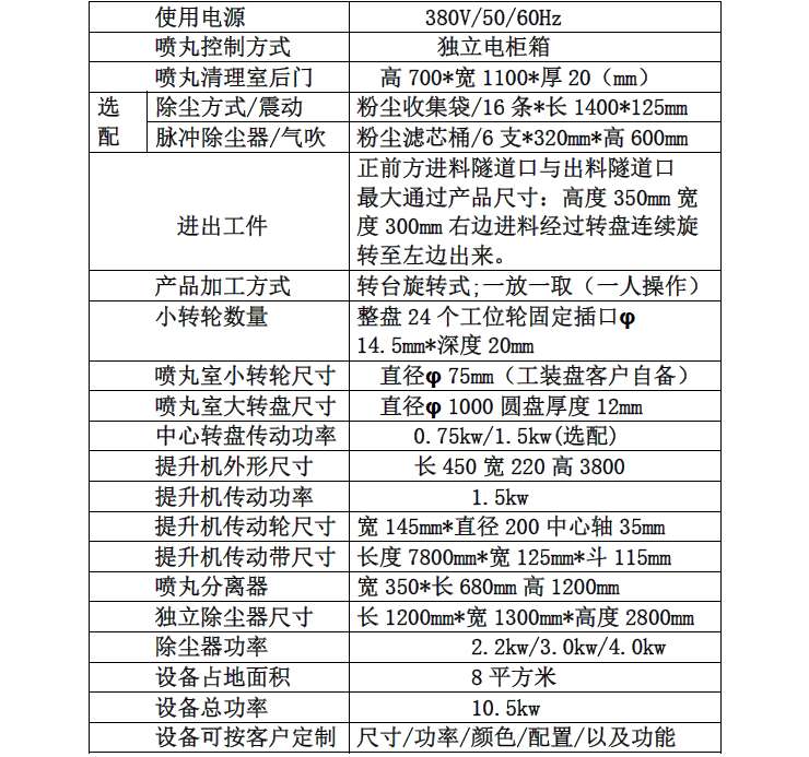 以非标定制,按照客户产品不同尺寸,表面处理效果要求来设计生产一款节能转盘喷丸机。